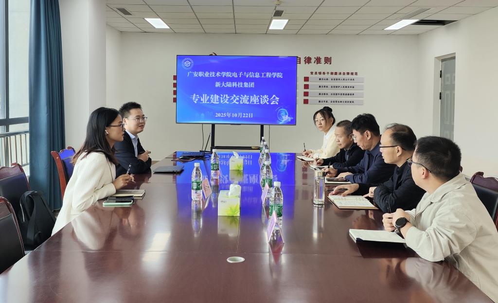 为深入推进产教融合,提升专业建设与产业发展的适配性,2025年10月22日,广安职业技术学院电子与信息工程学院与新大陆时代科技有限公司(以下简称:新大陆公司)举行专业建设交流座谈会。新大陆公司西南地区技术经理李林燚、王晓萍,电信学院院长王凤领教授、副院长赵勇教授,相关专业带头人及骨干教师共同参与交流。