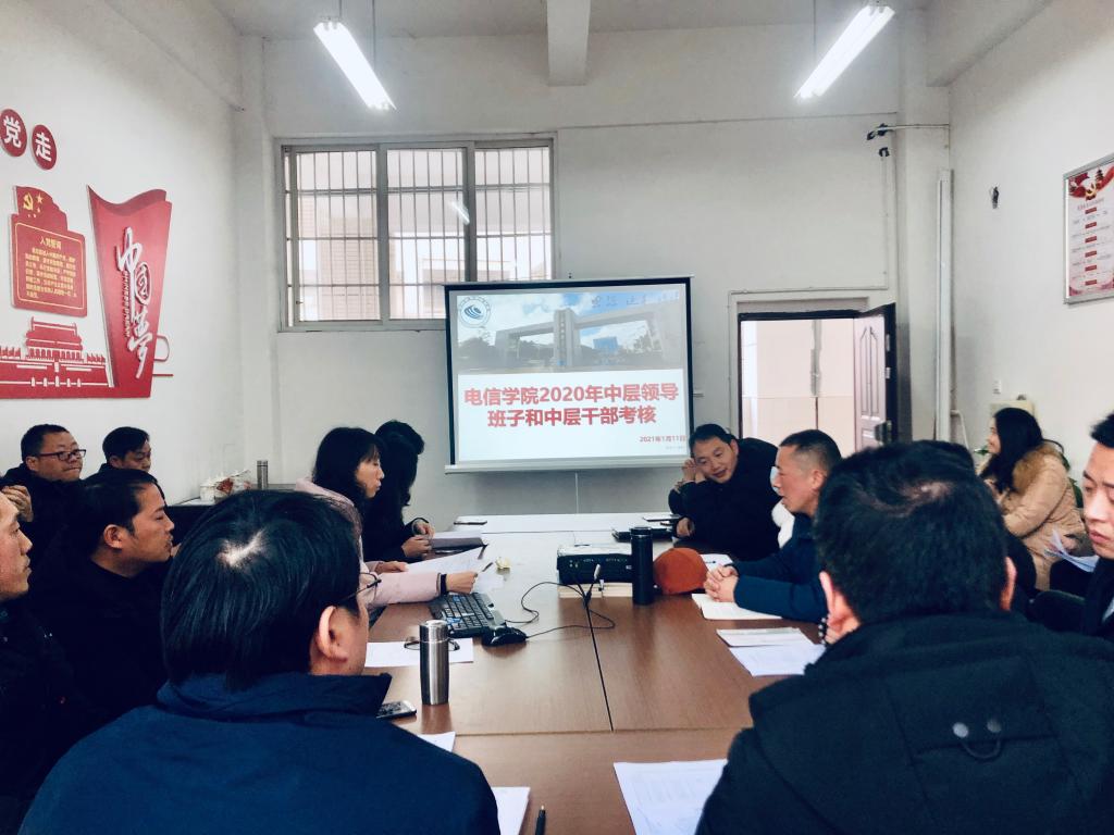 1月11日,电信学院于致用楼315会议室召开了“电信学院2020年中层领导班子和中层干部考核”会议。会上,电信学院党总支书记吴小平、院长曾德贵、教学科副院长汤仕平和学生科副院长吴建国分别作了年终述职报告。