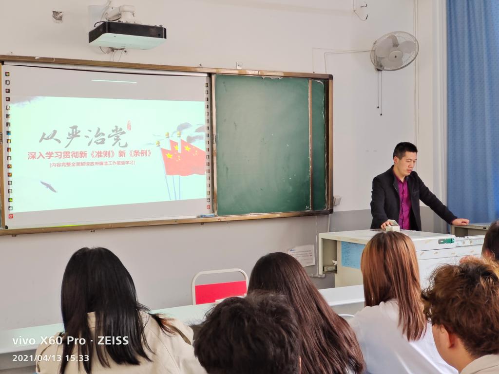 汤仕平同志引导同学们学习了《中国共产党廉洁自律准则》,他从廉洁自律准则的修订背景、具体内容等方面为同学们进行了解读。要求同学们无论是在学生时代,还是在以后的工作中都要严明政治纪律、政治规矩和组织纪律,认真落实中央的八项规定精神,做一个廉洁自律、道德高尚、严于律己的社会主义建设者。