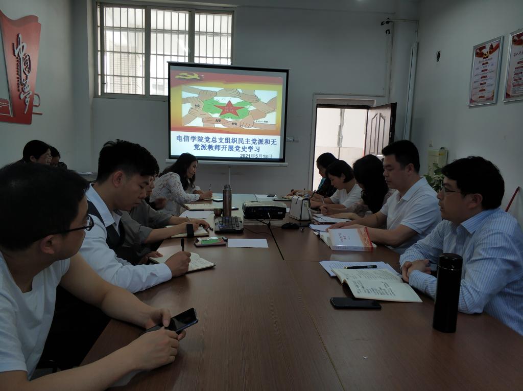 为认真贯彻习近平总书记在党史学习教育动员大会上的讲话,广泛传播党史知识、弘扬党的光荣传统和优良作风,提升民主党派和无党派教师的政治素养和思想水平,5月18日,电信学院党总支在致用楼315组织开展了一次党史学习,主要学习了《中国共产党简史》和《毛泽东邓小平江泽民胡锦涛关于中国共产党历史论述摘编》中的部分内容。本次党史学习由学院党总支书记吴小平主持,民主党派教师周定斌、黄元力,无党派教师杨陆军、毛金凤、王靖、彭玉涵及部分党员代表等参加了学习讨论。