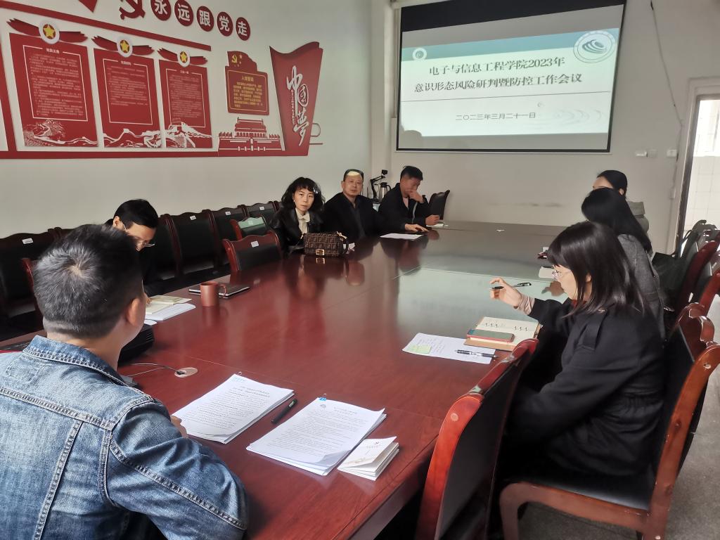 3月21日,电子与信息工程学院在致用楼315召开了2023年意识形态风险研判暨防控会议。会议由学院党总支书记吴小平主持,学院学管线工作人员以及各年级班导师、辅导员参加了此次会议。 会上,吴小平对2023年意识形态领域面临风险进行了研判。他要求各班导师、辅导员要进一步引导学生坚定理想信念、树立积极上进的思想,确保意识形态的正确导向,让青年学生始终不渝的拥护党的领导,坚定不移的贯彻落实党的各项方针政策,坚决做到听党话、感党恩、跟党走。