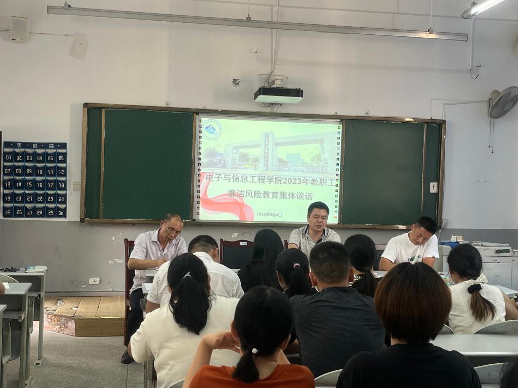 为了杜绝教学科研和学生管理过程中的不正之风,有效防范化解腐败风险,9月4月,电子与信息工程学院在致用楼316开展了2023年教职工廉洁风险教育集体谈话,会议由学院党总支书记吴小平主持。