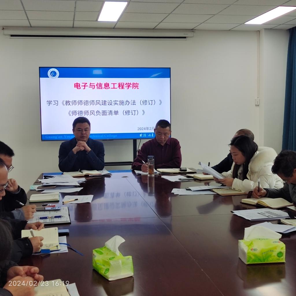 会上,学院党总支书记吴小平组织学习了《习近平总书记在中共中央政治局第十一次集体学习时强调 加快发展新质生产力 扎实推进高质量发展》的讲话精神,要求全体教职员工在新的学年里要迸发新的活力,高质量推进电信学院发展;组织委员杨晶晶同志组织学习了《教师师德师风建设实施办法(修订)》《师德师风负面清单(修订)》,希望全体教职员工严守师德底线,做“四有”好老师。