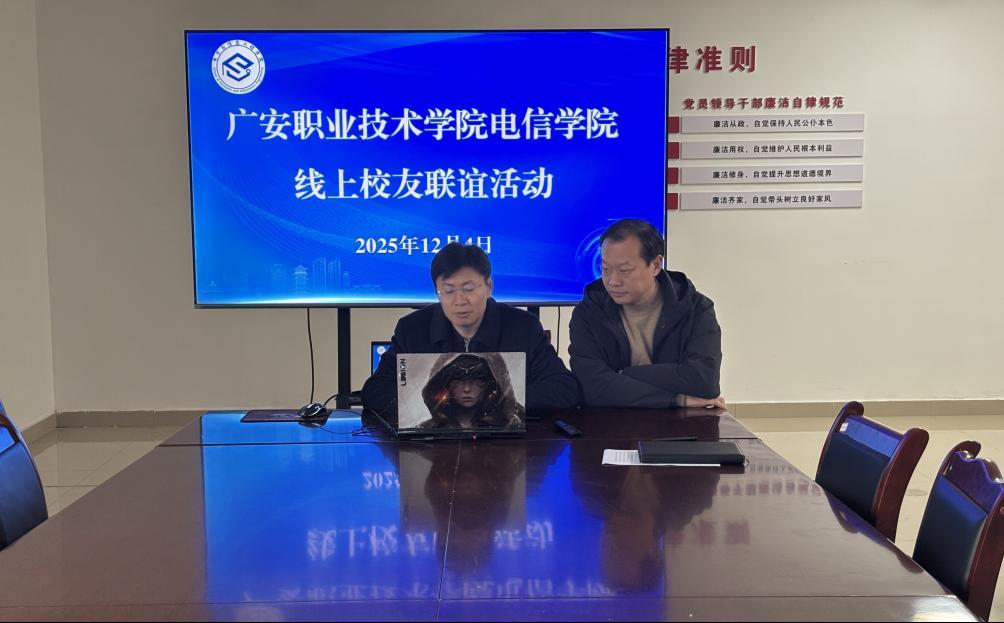 2025年12月4日,广安职业技术学院电子与信息工程学院在线上举办了主题为“校友云端聚,共话电信缘”校友联谊活动。此次活动旨在加强校友与母校的联系,促进校友与在校学生之间的交流。学院党总支书记喻忠、院长王凤领先后致辞,与校友共话发展、同叙情谊。数十名校友和在校学生代表参加线上联谊活动,活动取得圆满成功。