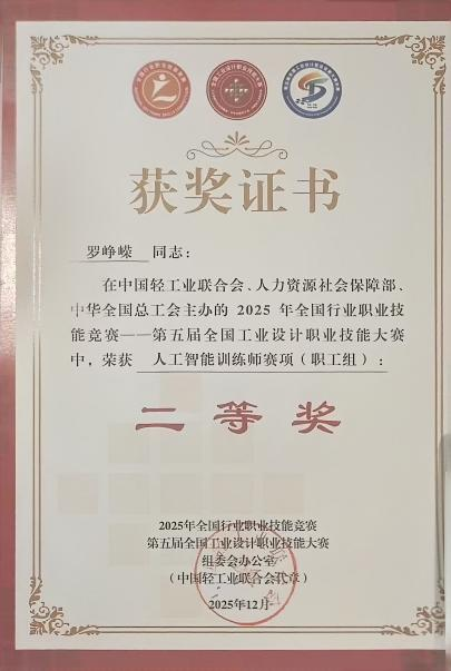 近日,第五届全国工业设计职业技能大赛全国总决赛在浙江宁波圆满落幕。我院专任教师罗峥嵘在比赛中发挥出色,经过激烈角逐,最终在人工智能训练师赛项中荣获全国总决赛二等奖,展现了扎实的专业技能与优秀的职业素养。