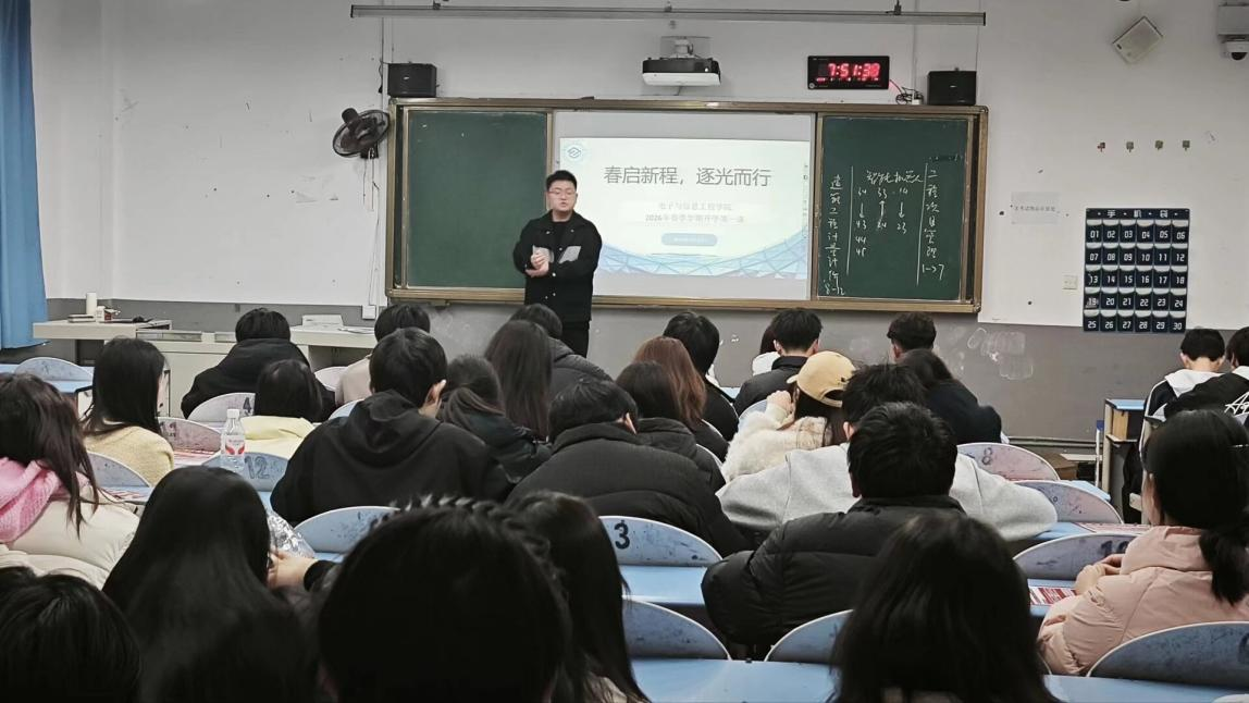 春风浩荡满目新,扬帆奋进正当时。为引导同学们迅速调整状态,以全新的精神面貌投入新学期的学习生活,电子与信息工程学院3月1日晚精心组织并开展了2026年春季学期“开学第一课”主题教育活动。本次活动覆盖学院全体在校生,旨在通过多维度的教育引导,为学子们新学期的成长与发展奠定坚实基础。